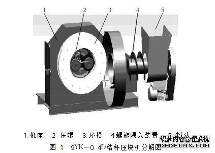 (1)壓塊機工作時,物料通過喂料斗及喂入螺旋機構的輸送,被均勻、連續地喂入環模與壓輥之間的腔體中 ,由環模與壓輥的相對運動把物料逐漸帶入環模 與壓輥的楔形間隙中,隨擠出力的增大,物料間聯結力增強被擠入環模孔內,當擠壓力增大到能克服模孔對物料的摩擦阻力時,不斷從環模孔中呈條狀擠出。擠出時物料被機體外殼上的切片切成長度適宜的草塊。壓塊機工作原理如圖2所示
