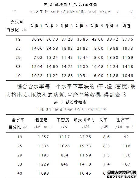 而生產率在含水率為19%和40%時生產率很低。其原因是含水率在19%時,草塊與模孔的摩擦力很大,草塊移動速度緩慢,草塊成型雖好,但生產率很低,且生產出來的草塊內部和表面焦糊現象嚴重;含水率在40%時,雖然消耗的功率較少,但草塊成型不好,為片層狀,很容易碎裂,且碎末較多。這是由于物料含水率越高,物料與環模孔壁之間的摩擦力越小,壓制成的草塊越較容易從環模孔擠壓出來,降低單位產量的能耗,但是由于摩擦力減小,草物料在環模孔里停留的時間就會縮短,使草塊的密度較低和表面粗糙,造成草塊的成型率低,導致生產率較低。含水率在25%~33%區段草塊成型較好,含水率為25%時,草塊與模孔的摩擦有所減小,出塊相對順暢,生產率得到提高,但草塊最大擠出力、壓塊機消耗的功率在此區間仍很高,且草塊表面仍有焦糊的現象。因此,綜合考慮草塊的(干濕)密度、最大擠出力、壓塊機的功率消耗、生產率等各項指標,確定含水率約為29%時,最大擠出力較小、功率較低、密度適宜、生產率較高。